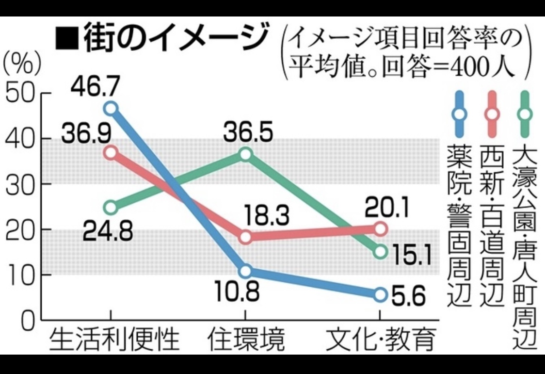 根據西日本新聞報導指最近一間市場調查公司ジーコム為福岡市內居民進行了一個最理想住區調查,在福岡市內15區中,從生活便利性、居住環境、文化教育水平三大方面,分析了首五位人氣地區,首位是大濠公園・唐人町周辺32.8%、第二位是西新・百道周辺27.3%、第三位是桜坂・六本松周辺18.5%、第四位是薬院・警固周辺18.0%,而第五位是藤崎・室見・姪浜周辺13.8%。